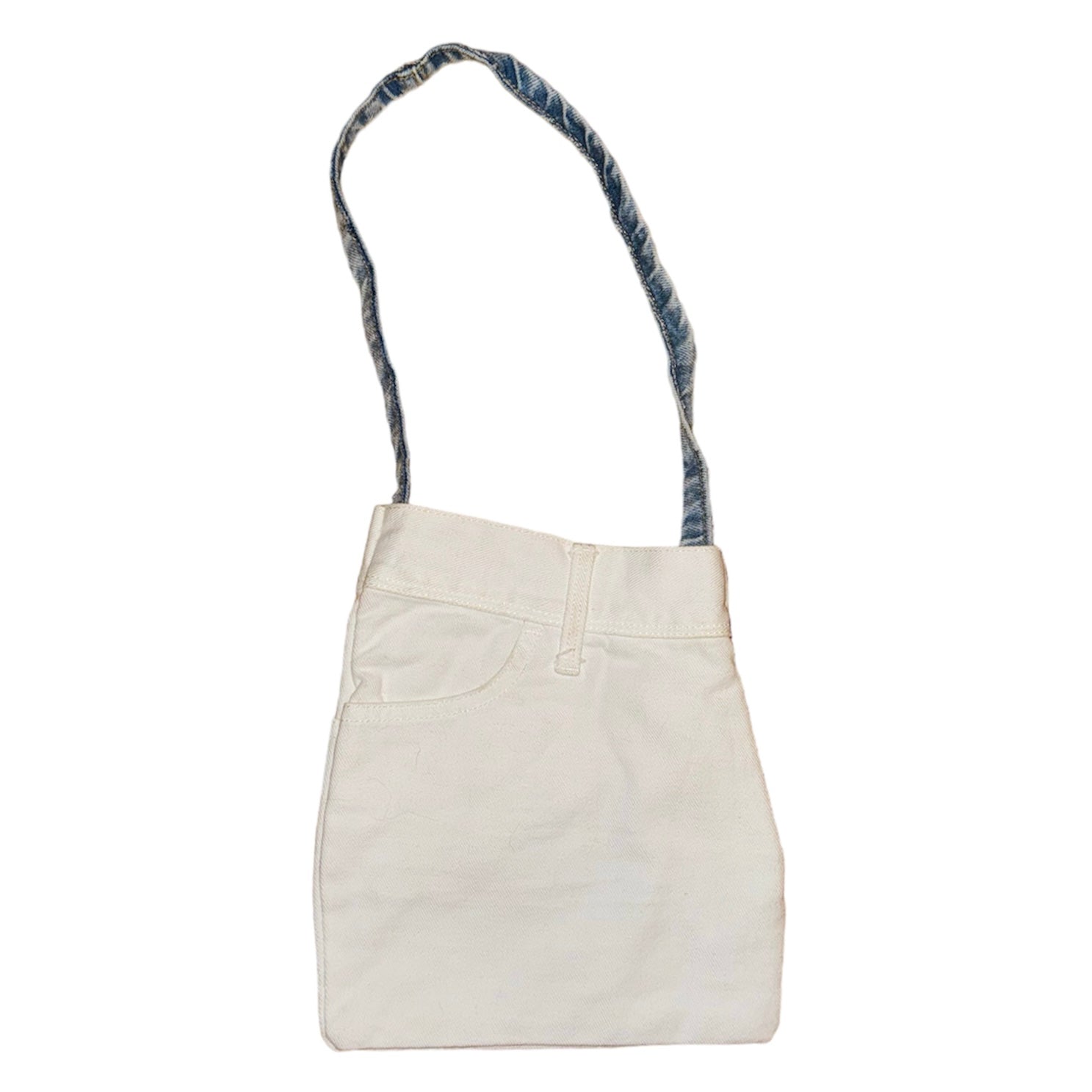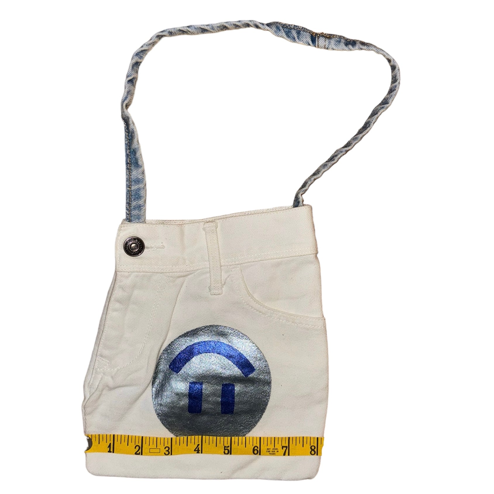 Upcycled hand sewn bag with hand painted smiley face from vintage denim.