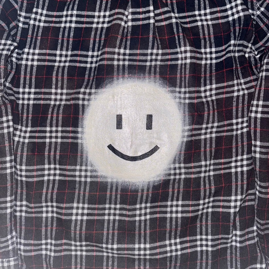 Upcycled bleach flannel with hand painted smiley face.