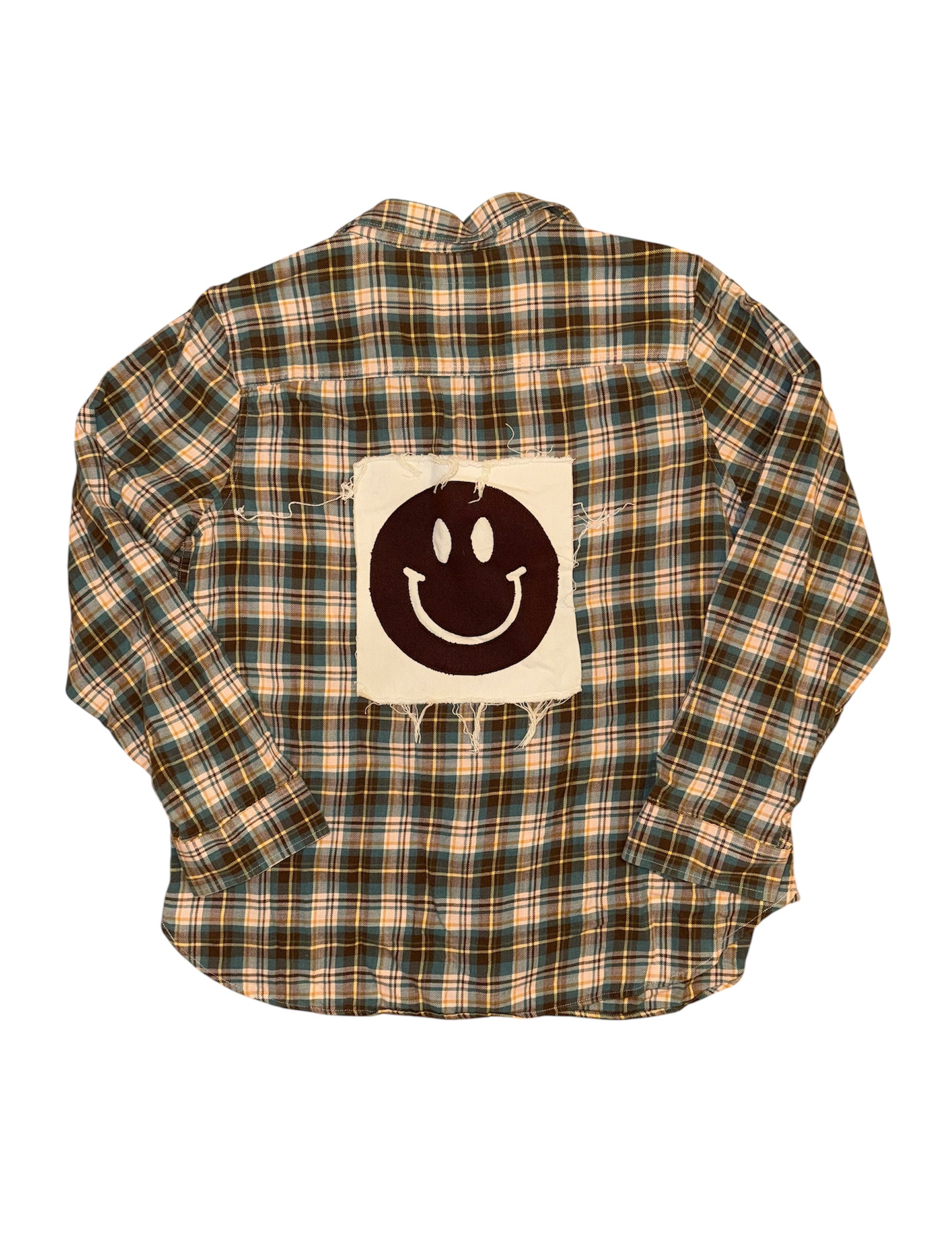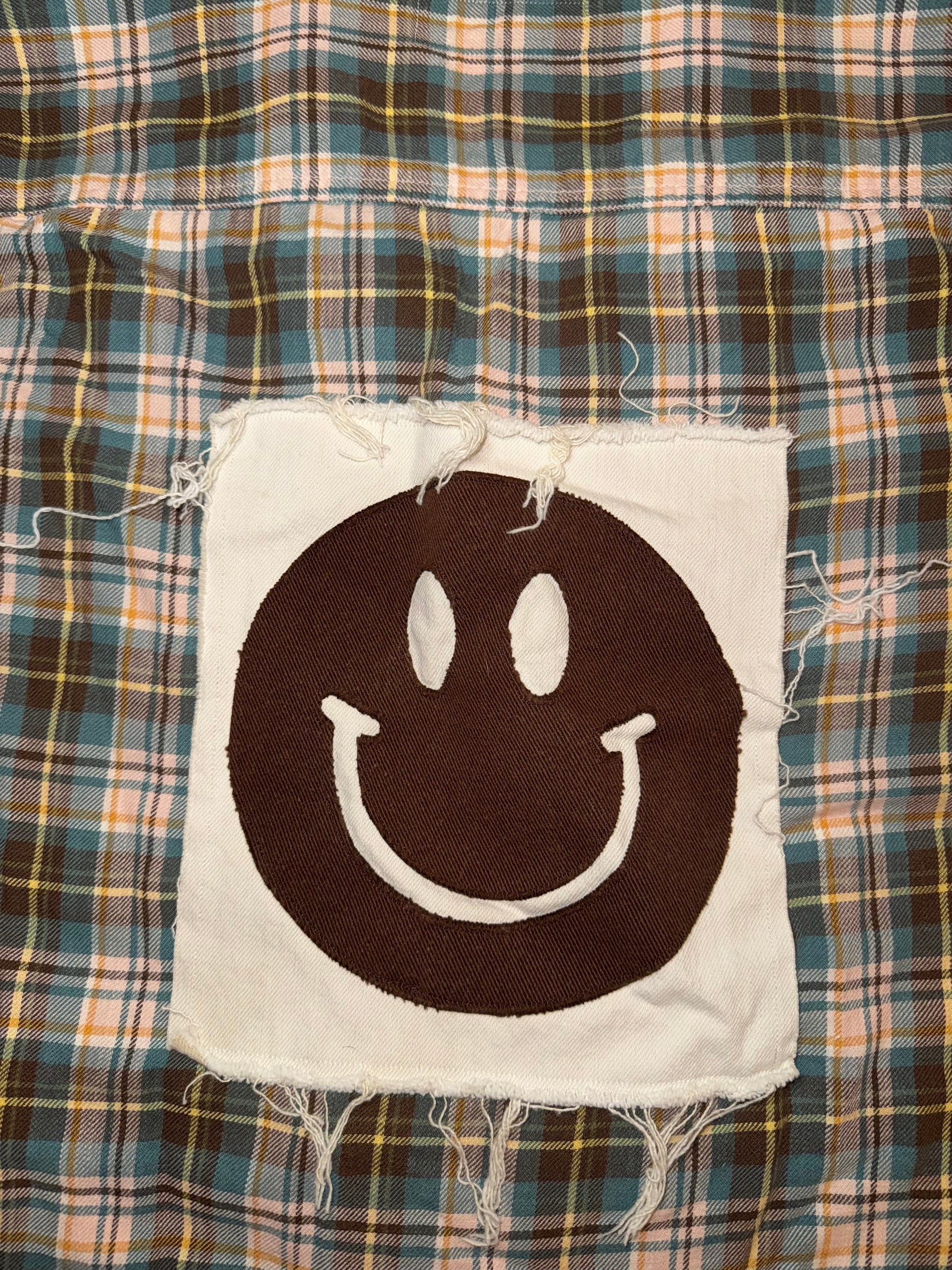 Upcycled flannel with smiley face from vintage jeans.