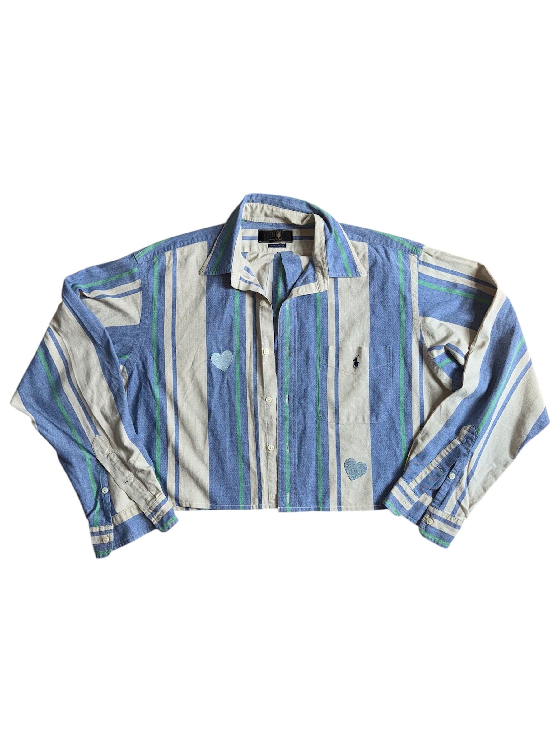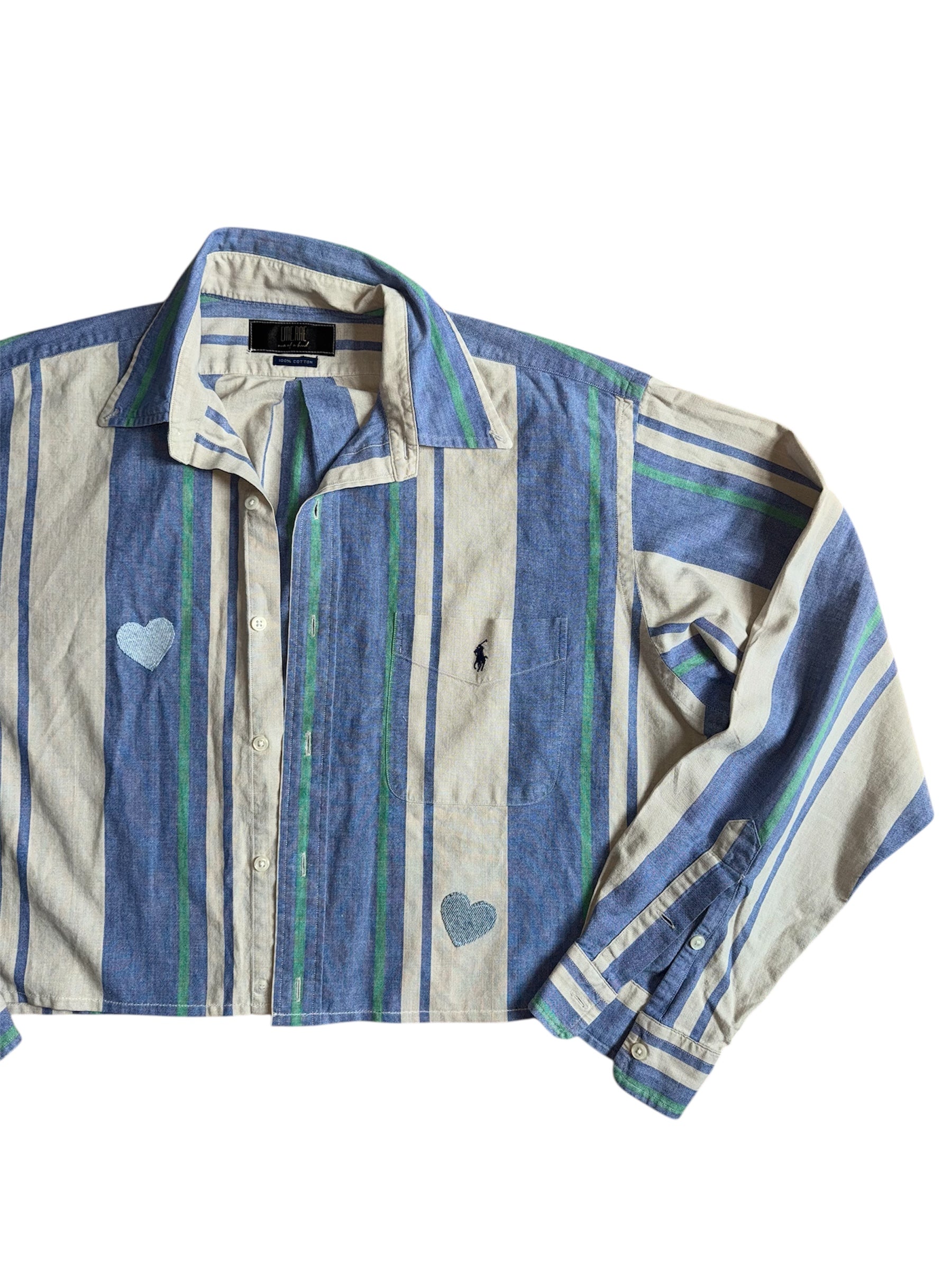 Upcycled Polo Ralph Lauren cropped button down with hearts from vintage denim.