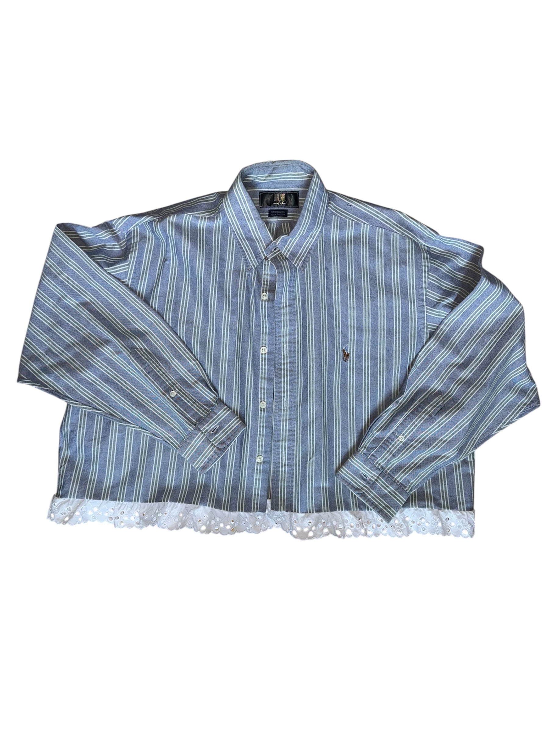 Upcycled Polo Ralph Lauren cropped button down with eyelet trim.
