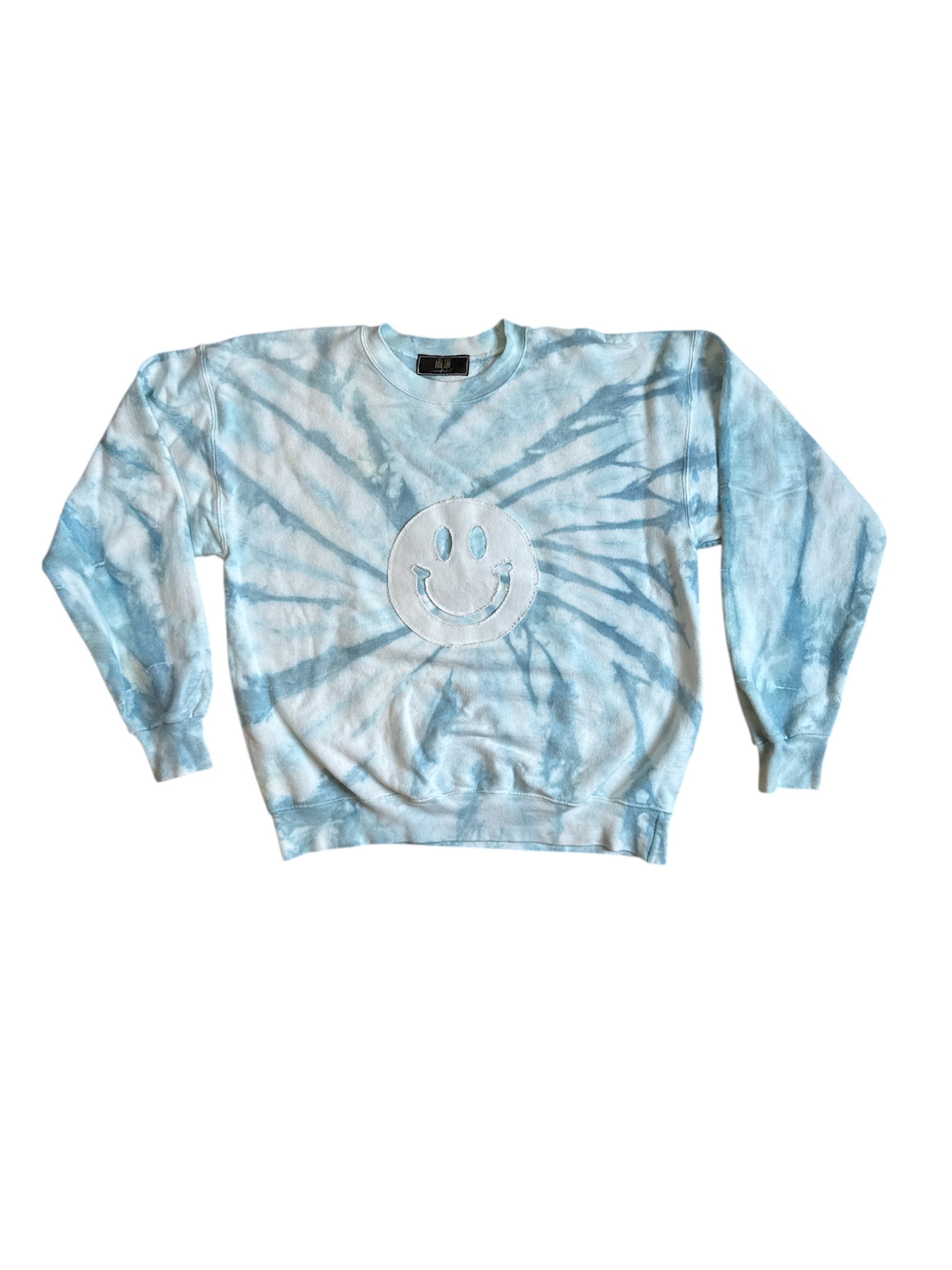 Upcycled tie dye sweatshirt with smiley face from vintage jeans.