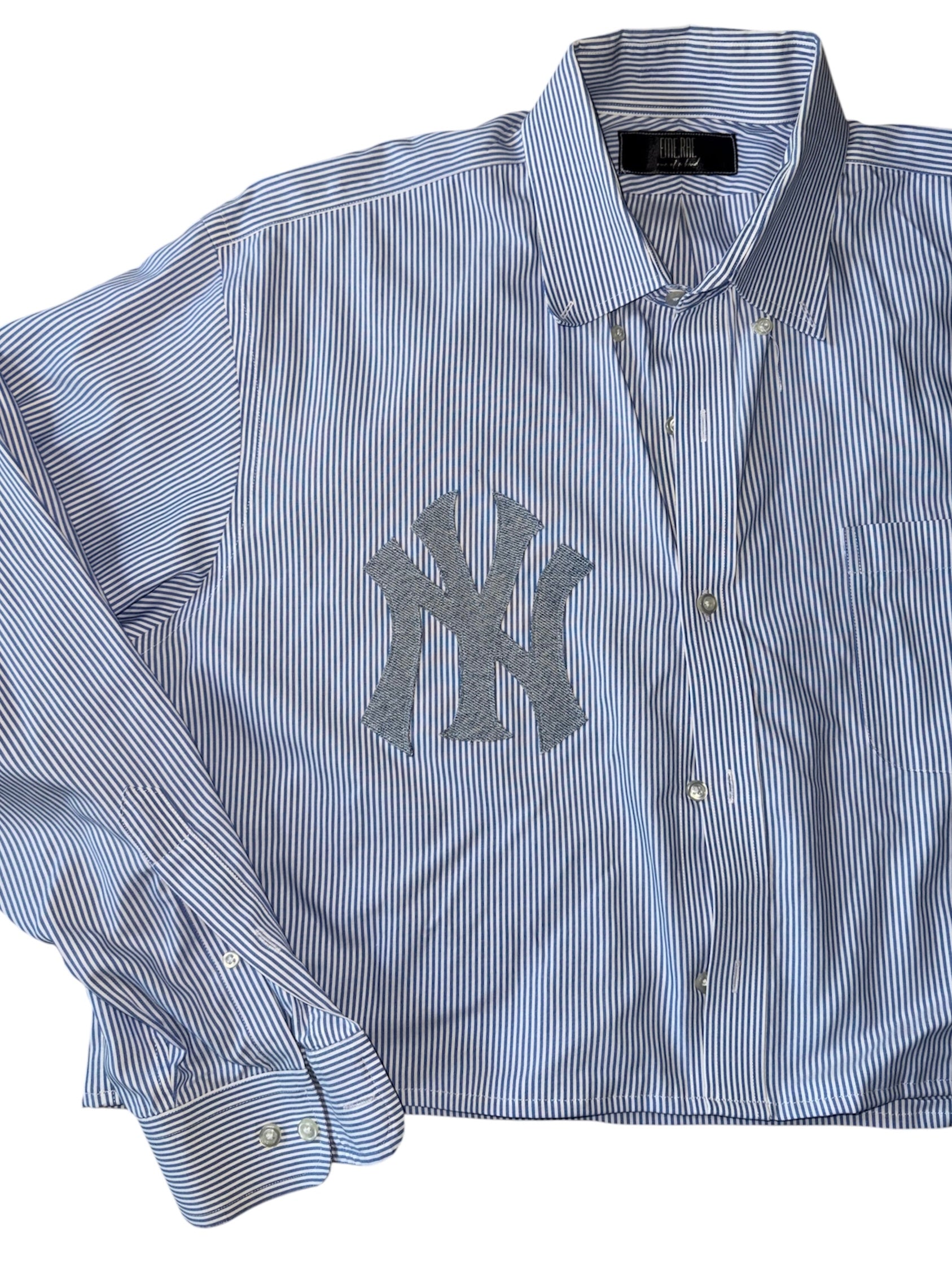 Upcycled New York Yankees Lands’ End button down shirt. Size before cropping is 17 1/2 - 34.