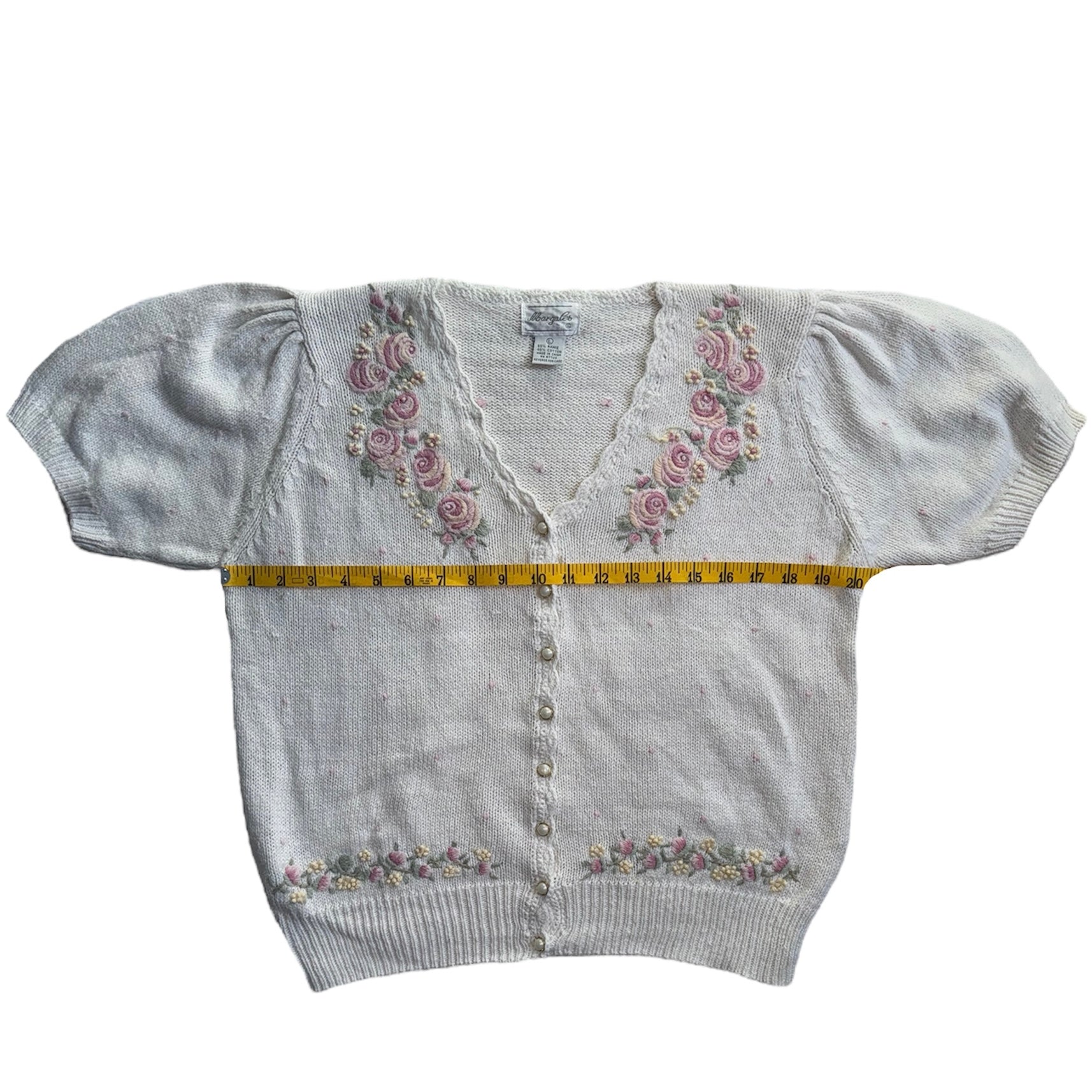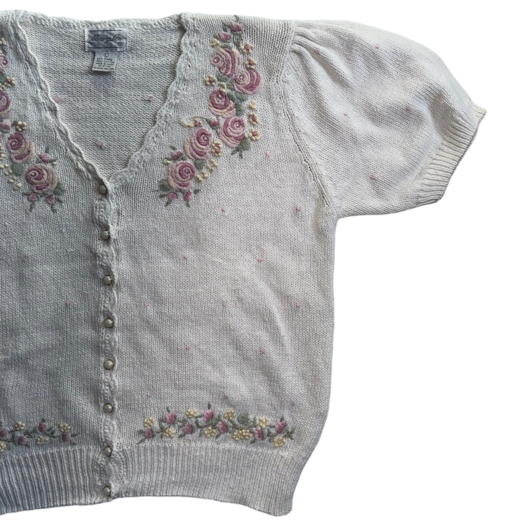 Vintage short sleeve white sweater with flowers and pearl buttons.